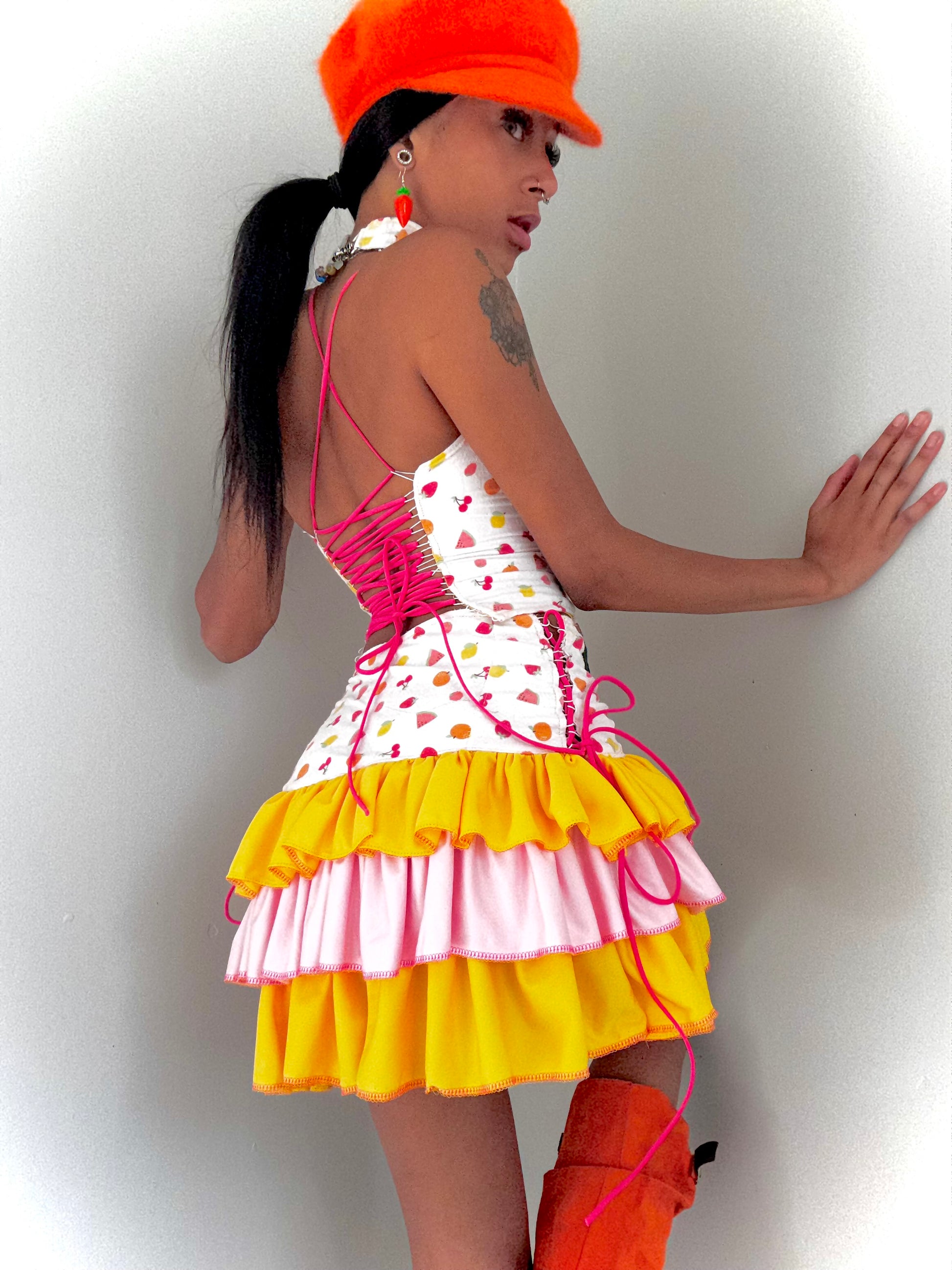 includes adjustable ruffle skirt , stretch lace up back top and choker !!