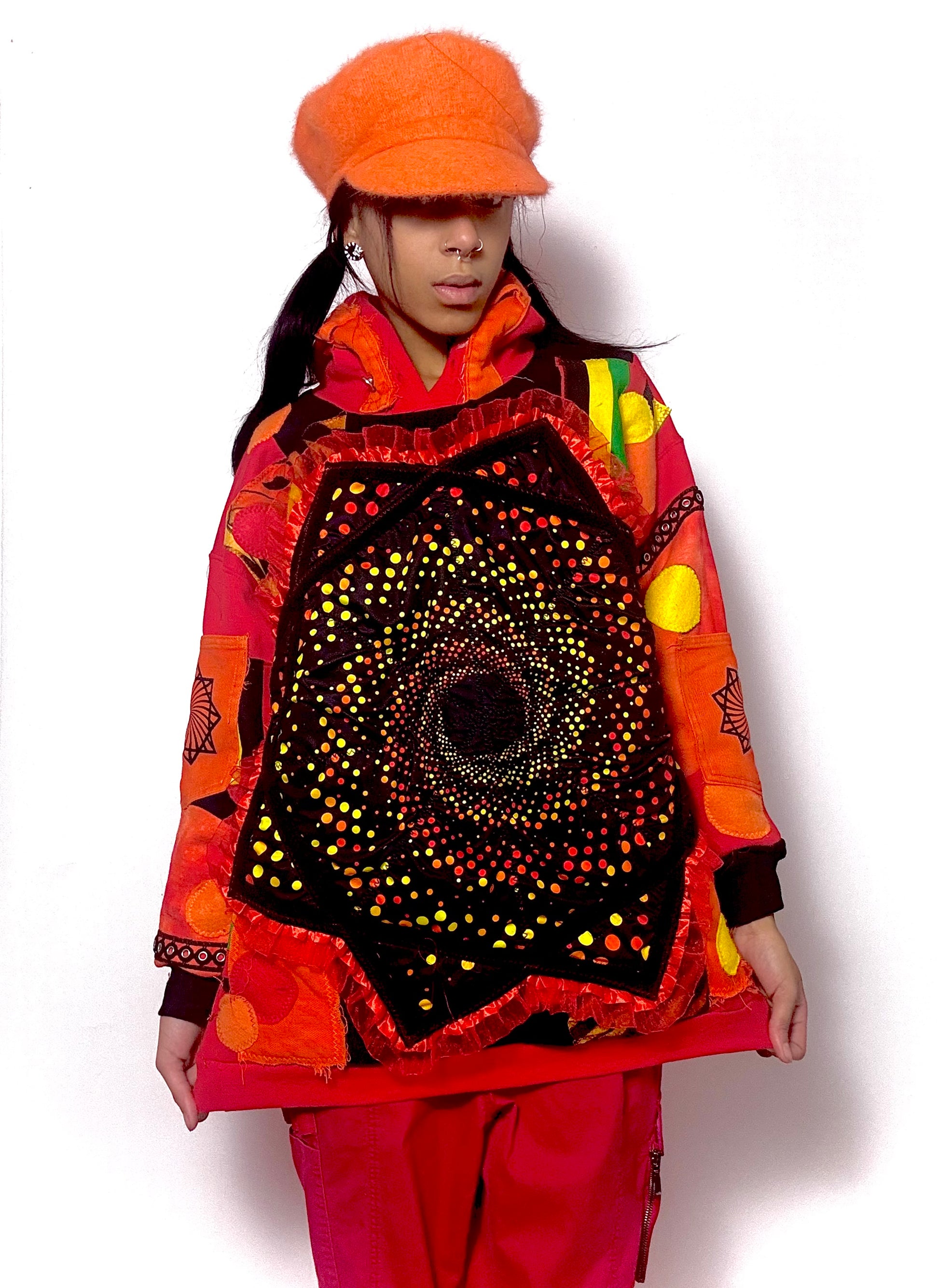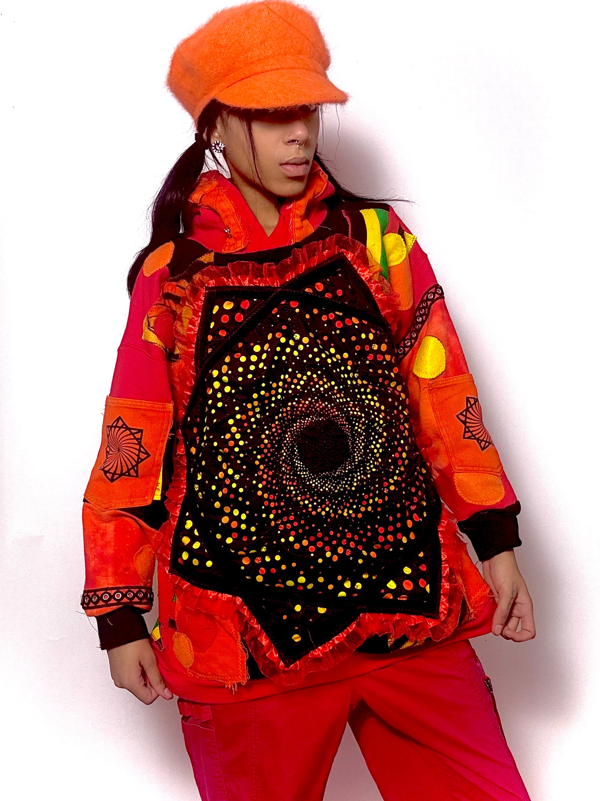 Handmade 1of1 upcycled hoodie ! Featuring donated Flowstar as well as various second hand fabrics such as cargo pants , T-shirt , cotton prints , felt and vinyl transfers . back features a hand pressed vinyl wording and all pockets are fully functional !